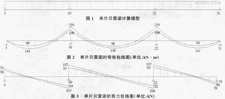 现浇箱梁结构自重:8.454kN/m~18.015kN/m(中间小,两头大,呈抛物线分布);模板:0.31kN/m;人、机荷载:0.44kN/m;振捣混凝土产生的荷载:0.88kN/m;贝雷梁上钢管支架:1.08kN/m;贝雷梁上方木:0.10kN/m。