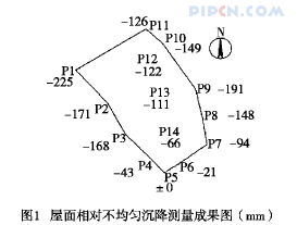 屋面相对不均匀沉降测量成果图如图1所示。由图可见:该房屋最大相对沉降值为225mm,西北角部的P1点为整个建筑的最低点,南方角部的P5点为最高点,整个房屋基本呈现东南高西北低的趋势。这一结果与房屋倾斜趋势基本一致。