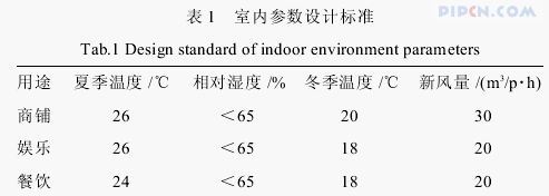 该广场所有商铺均设集中空调,而走廊、内庭院等公共空间均不设置空调系统,空调面积为 4.1 万 m2,其中商铺 2.6 万 m2,餐饮 7 000 m2,娱乐 8 000 m2。空调使用时间为早 9:00 至翌日凌晨 3:00,不同性质的商铺空调室内设计参数如表 1 所示。