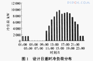 图 1 给出了该建筑逐时负荷分布情况,设计日尖峰冷负荷为 9 626 kW,总冷负荷为 102 312 kW·h,高峰出现在白天,23:00 后冷负荷仅占总冷负荷的 7%,采用蓄冷空调方案理论上是可行的。