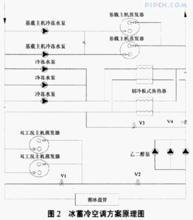 采用分量蓄冰模式设计,双工况制冷主机和蓄冰盘管为串联方式,冷水机组上游。系统需配置空调工况制冷量为 500 RT、制冰工况制冷量为 344 RT 的双工况水冷螺杆机组 2 台,另需配置 2 台制冷量为 500 RT的常规制冷主机作为基载,以负担白天部分负荷及晚上全部负荷。
