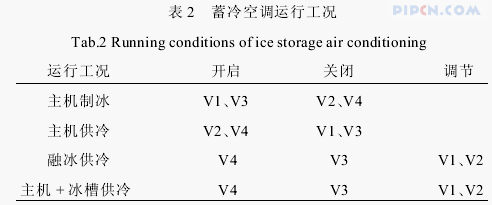 蓄冰盘管用导热塑料盘管蓄冰装置,共 15 台蓄冰量为 390 RTh 的蓄冰盘管,最大蓄冰量为 5850 RTH。板式换热器乙二醇侧为 3.5 ℃/11 ℃,冷水侧为 12 ℃/7 ℃的换热量为 3 100 kW 的换热器 2 台。制热板换采用蒸气侧为 145 ℃/90 ℃、热水侧为 55 ℃/45 ℃、换热量为 2 700 kW 的换热器 2 台,详细布置见图 2。表 2 给出了不同运行工作方式下各阀门智能控制情况。