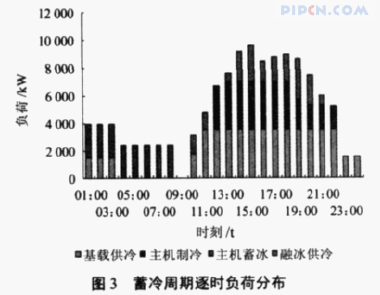 设计日冷负荷时蓄冰空调运行策略按图 3 方式运行。当空调日冷负荷较小时,系统将根据实际的冷负荷需求,通过控制系统调节运行模式,按照融冰优先的原则,最大限度减少制冷主机在电力高峰时期的运行。