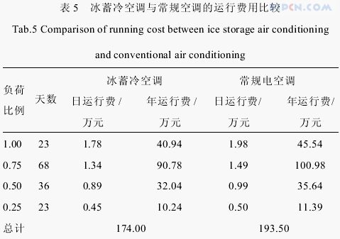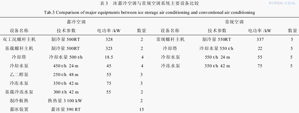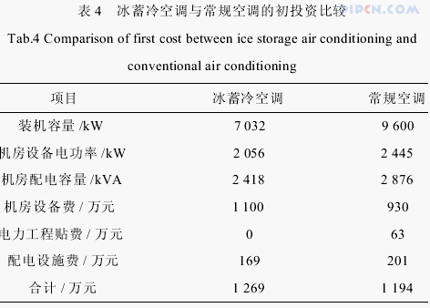 表 3、4 分别给出了蓄冰空调与常规空调主要设备及初投资比较。可以看出,冰蓄冷空调系统因增加了蓄冰设备,增加的初投资为 75 万元,同时采用冰蓄冷可使制冷机组的容量减少 36.5%,降低了装机容量和电力设施投资。