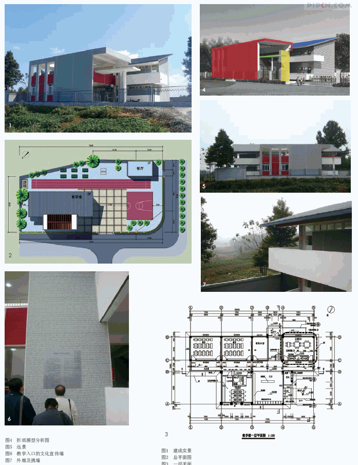 建筑师梦回童年:儿时的记忆如同幻灯片般在脑海闪过,小学手工劳动课的折纸游戏画面定格在那儿!假如一座抽象化的“卡片楼”(图4)矗立在校园里,孩子们能否喜欢?虽然它不似变形金刚般具象,但至少红色的教学楼门厅被白色的“片”墙包裹,单坡屋面,挑板雨篷,以及寓意“从小到大”的变截面圆柱都成了生动的“彩色穿插体”。少儿学生们也确实觉得此样的教学楼非同一般的建筑。援引雅安市教育局长的话:“老百姓议论这座与众不同的小学,都要把孩子送来上课。原来每班40人的名额现在50多人报名”。作为一所重建小学,它具备了相应的教学设施,更创造了迥乎以前的学习环境,倾向于小学生的心理接受度;孩子们眼中索要的彩色世界,丰富的形体成为被拆解开的“折纸模型”跃然图面,并为各级领导审定确认为实施方案(图5)。
