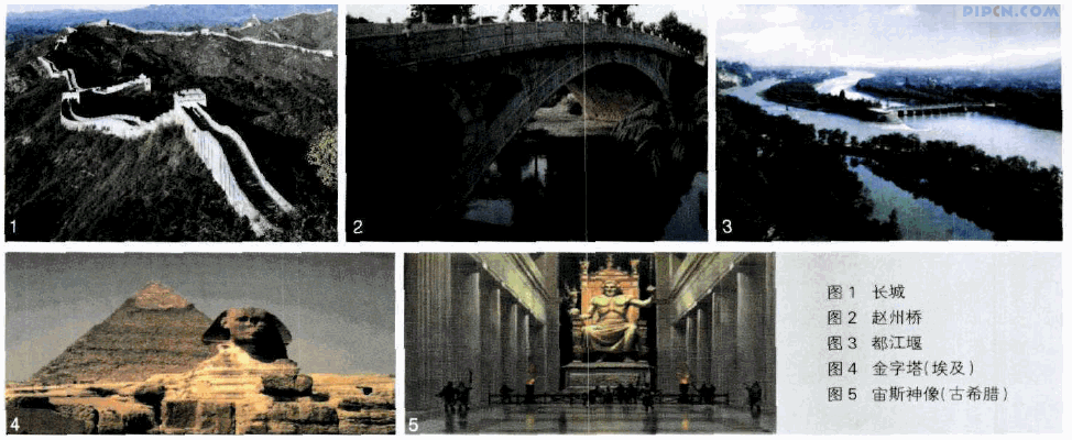 远在上古时期,中国古人类就在野处穴居,为了避免野兽侵袭,有巢氏(中国的传说中的巢居的发明者),才教古人离开天然岩洞、构木为巢,居于树上。我国古代土木工程多采用土、石、木等材料建造,建造技术和艺术造型达到当时极高的成就。像长城(图1)、赵州桥(图2)、都江堰(图3)等都是具有代表性的中国古代土木工程的杰作。