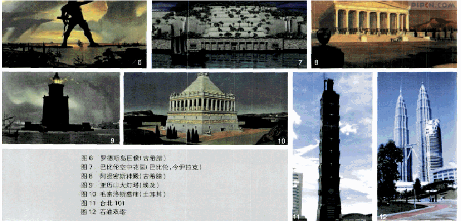 在欧洲,大约8000年前已开始采用晒干的砖;凿琢自然石的采用,大约在5000~6000年前;至于在建筑中采用烧制的砖,亦有3000年的历史。世界古代的伟大建筑,以公认的七大奇迹(图4~图10)最为引人注目,它们都建于公元前600年~公元前200年,且均为石材建造,大都用于宗教、军事和航海。且都是建于当时经济和科技非常发达的地区,说明土木工程的发展与经济繁荣和科技进步是密不可分的。