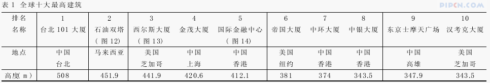 随着19世纪中叶钢材及混凝土在土木工程中的开始使用,以及20世纪20年代后期预应力混凝土的制造成功,建造摩天大楼、大跨度建筑和跨海峡1000m以上的大桥成为可能。目前,世界上最高建筑是中国台北的101大厦(图11),总高度为508m,世界前十大高层建筑见表1。近代体育事业的蓬勃发展也使得大跨度房屋在世界各地如雨后春笋般涌现,图15和图16为比较典型的优秀奥运会体育场馆。