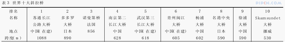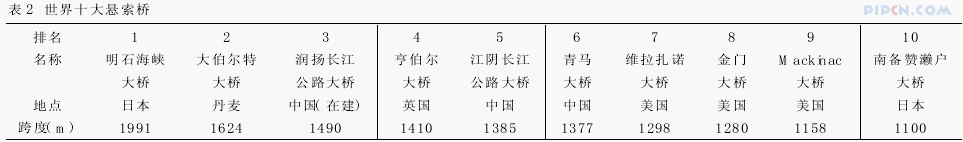 目前世界跨度最大的悬索桥是日本的东线明石海峡悬索大桥(图17),跨度为1990m;最长的斜拉桥是日本的多多拉桥,桥主跨有890m(图18),预计在不久的将来中国的苏通长江公路大桥(图19)将刷新这一世界纪录。最大跨度的拱桥是中国上海的卢浦大桥(图20),跨度为550m。世界十大悬索桥及斜拉桥分别见表2和表3。