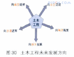 地球上可以居住、生活和耕种的土地和资源是有限的,而人口增长的速度是不断加快的。因此,人类为了争取生存,土木工程的未来至少向五个方向发展(见图30)。