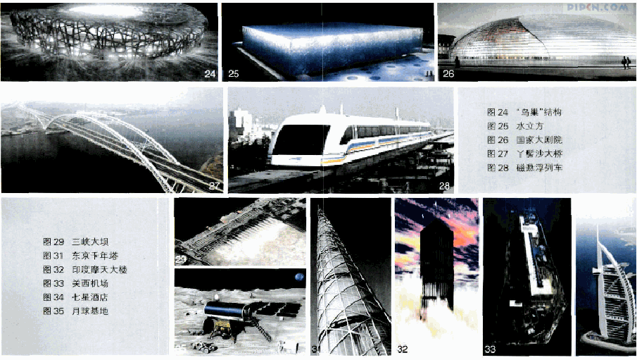结构工程:改革开放后在我国大陆建造了许多高层建筑,目前我国最高的建筑是世界排名第4的上海金茂大厦(图21)。其他具有代表性的高层建筑还有深圳的地王大厦(图22)。在特种结构方面,我国有4所电视塔排在世界前十位,其中1995年建成的上海东方明珠电视塔(图23)以468m的高度排在世界第三位。为迎接2008年的奥运会,北京将建设一大批大跨超长建筑,像国家体育场“鸟巢”结构(图24)、国家游泳中心“水立方”(图25)、国家大剧院(图26)等。表1表明,无论在工程结构的改革、建筑功能使用、新技术和新材料的采用上及合理组织施工方面,还是在抗震分析和计算机程序应用上及有关抗震控制试验研究上,我国均达国际先进水平。