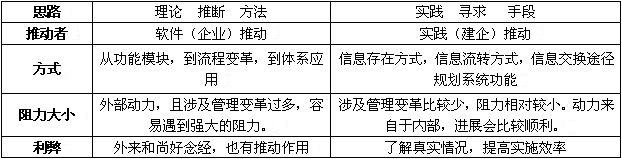 系统规划方式。大型国企,有激情、有能力的,采用自主开发,持续10年、15年信息系统基本能够成型。介于自主开发和外包(实质是外购)之间的方式,是深度参与的合作开发。不同方式,各有千秋。下面对比了两种规划信息系统的方式,寻求两者的结合点,是比较好的方式。