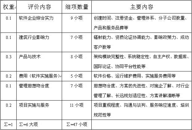 我们的选型原则是:独立思考、理性判断、认真研究、谨慎决策。这一个工作,是在规划阶段进行的。该阶段要做三项主要工作,即:进行现状调查;进行系统规划;落实选型方案。集团在选型方案时,制定了信息化建设软件商评分标准——6大项47小项指标,进行量化评估: