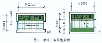 双排型厨房——如图 2(b)所示,动线距离变短,且直线行动减少,但操作者经常需要转180°,由于设备增多,储藏量明显增加,且操作平面较多,使用面积约4 .5m2。