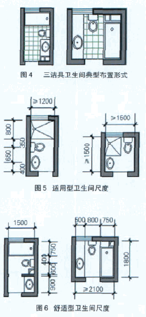 《住宅设计规范》(GB50368-2005)规定套型面积1 00~120m2 的住宅可设两个或两个以上的卫生间。在中小套型住宅中,建议设置1~1.5个卫生间,即在面积允许条件下,在入口或靠近公共区域设供客人使用的仅有一件或两件卫生洁具的卫生间,以提高居住部分的私密性。中小套型住宅的卫生设备以三件套为主,比较典型的三洁具卫生间布置方式有两种基本形式:长方形和方形(图4)。