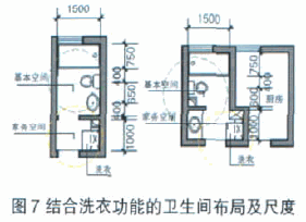 住宅的基本功能还包括家庭洗衣、清洗等家务功能,包括清洗工具的清洗及有关用品的储存等。住宅内的洗衣机设置有几种选择:一是放在卫生间前室;二是放在卫生间内;三是放在服务阳台;四是放在独立的洗衣间。前两种做法都要求我们在进行卫生间设计时将其与洗衣等家务劳动相结合。因洗衣机放在卫生间内会比较潮湿,建议在中小套型设计中将洗衣及部分储存功能与卫生间前室结合。图7 给出了洗衣、储存与卫生间前室结合的两种可能。