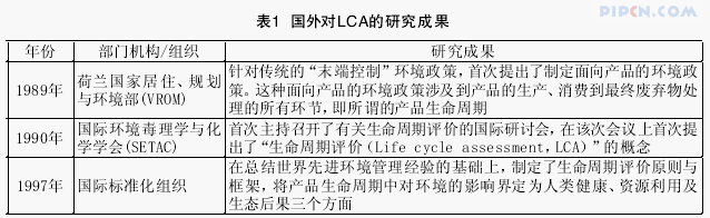 生命周期评价LCA(Life—Cycle Assessment),这一概念最早由美国可口可乐公司的哈利提出,是可以用来评价产品、过程或活动对环境影响的工具。20世纪70年代LCA主要应用于对产品包装的分析、评价,到了8O年代后期,这一方法被广泛应用于有效测量给定产品或过程的环境负担。经过不断发展,LCA逐渐成为对产品或生产过程进行分析的一种合理化方法,如表1所示是国外对LCA的研究成果。
