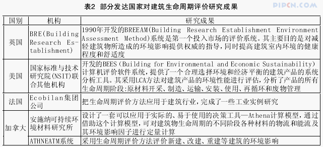 对于建筑产品,其生命周期是指从建筑的规划、勘察、设计、施工建设、使用、维修,直到报废为止的整个时期。国外对于建筑材料和建筑物的生命周期评价的研究开展得比较早,而且也取得了一定的研究成果。其主要是对建筑物生命周期的能量消耗和温室气体的排放进行分析。在这方面,一些发达国家都进行了深入的研究,如表2所示[5]。