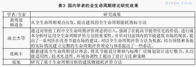 (5)对整个建筑项目的生命周期评价研究,大部分的文献根据LCA的概念提出评价的理论框架。国内一些学者对全生命周期评价理论进行了系统的研究,如表3所示。