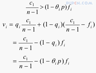 (5)为陪标人i 进行陪标而不被查处的概率为 qi(i = 1,2,…,n-1),令 qi= θip,其中 θi为信息封闭率,0 < θi ≤1。当 θi= 1 时,表示陪标人i 对串标者绝对忠诚,串标行为只有当事人知道,信息绝对安全;当 θi 不断减少时,表示陪标人 i对串标者越来越不忠诚,信息封闭程度低,甚至可能检举该串标行为,即被查处的可能性越大。