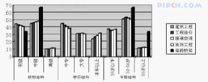 (1)从职称结构看,基本上以中初级职称为主,高级职称比例较低。其中,道路桥梁专业的中级职称较高,而高级职称几乎很少。
