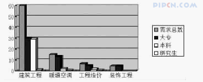 (1)统计结果表明:建筑工程专业(以前称之为工民建专业)人才需求量很大,在所统计企业中需求量平均为 60 人,暖通空调专业平均为 15 人,造价专业平均为 6.4 人;建筑装饰专业平均为 4.4 人;其他专业也有少量需求。