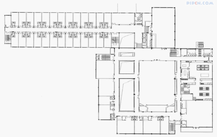 3.1 功能设计:蓉园 8 号楼建筑以原有 3 层客房为设计基础,与扩建部分进行了功能上的整合,由公共大堂为交通枢纽分别连接客房和扩建的会议,餐饮等功能配套用房。拟保留的客房楼和大堂在原有基础上,设计将现有功能进一步完善,增加服务配套用房和设施,如布草间、行李间、开水间、消毒室、员工休息室、电梯等。扩建部分分为地上二层和半地下层,其主要功能分布,一层中心部位设有宴会厅前厅和可容纳 400 人的宴会厅 1 个,周边环廊临近大堂位置设有贵宾接待室,另外10 余间VIP 包厢分别依西、南两向环绕内庭院布置。主厨房设在宴会厅东侧,并通过内环廊与宴会厅相连。大堂吧(茶座、咖啡厅)紧邻大堂布置,同时亦与餐饮部分有方便的联系。半地下层为宾馆服务人员配套用房和厨房部分的粗加工及库房。二层中心部位设有多功能厅前厅及 300 座多功能厅 1 个,沿周边环廊设有中心会议室 2间,中餐厅(兼自助餐厅)1 个和若干 VIP 包厢。扩建部分一、二层均利用两个矩形的宴会厅前厅和多功能厅前厅,与大堂和客房部分紧密联系,实现了各功能的有机联系和整合。