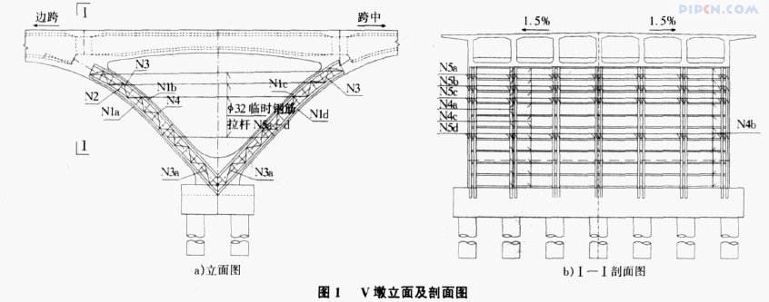 漳州象镇大桥是跨越西溪河,连接龙海滨江公路和208省道的大桥。其中跨河的主桥是一个37.5m+63m+37.5m的预应力混凝土V型刚构桥,桥宽29m(其中两侧翼缘板宽2.5m,箱梁体宽24m),箱梁截面为单箱六室形式,基础为钻孔桩加承台的形式,V型墩底部采用劲性骨架、钢绞线及钢筋混凝土与承台固结,V型墩与箱梁体同宽为24m,V型墩的高度为11.18m,V型墩两斜腿最外侧的距离为24.67m,由无缝钢管组成的劲性骨架设置在V型墩的两斜腿之内。(参考《建筑中文网》)
