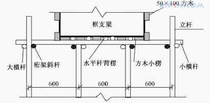 空间排架由多个平面排架组成,由小横杆的受力方向和挠度确定。计算时可以先考虑0·8m宽的梁设4排平行排架,立杆间距为600mm,小横杆间距为600mm,跨度为600mm,水平杆和方木小楞间隔密排(水平杆5根),水平杆主要承受模板传递的竖向均布荷载,大横杆最大间距为850mm,中间设剪刀撑;其中立杆、水平杆、大横杆、小横杆均为Φ48mm×3·5mm钢管。梁底支撑截面如图2所示。