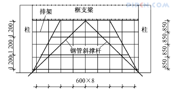2)埋设埋件和转换梁支撑 荷载传递中重点解决的是转换梁的荷载传递,其荷载在向下部结构传递的同时,也向竖向构件传递和分散。转换梁支撑采用埋设附加钢管支撑桁架和梁下钢管排架的综合受力支撑体系。转换层自重和施工荷载由两部分承担:①利用转换层下部结构柱的传力作用来分担 由柱根部预埋的4排钢管斜撑杆组成的平面桁架支撑(见图1),桁架斜撑杆间距为600mm,水平拉杆间距均≤1200mm;②由梁下设置的排架体系承担(见图1) 排架立杆间距600mm,大横杆间距850mm,梁底用水平钢管和方木间隔密布作为模板背楞。所有支撑材料采用Φ48mm×3·5mm的Q235钢管,为确保支撑架施工过程中使用安全可靠,验算支撑受力性能时,钢管降低规格(按Φ48mm×3·0mm)验算复核,即截面面积A=423·9mm2,截面系数W=4490·69mm3。