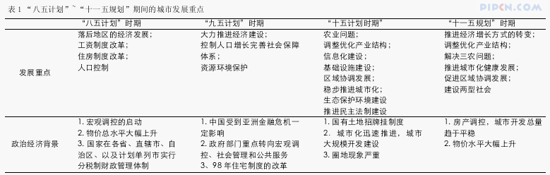 1990 年到 2008 年近 20 年的时间,中国经历了4个“五年计划”(规划),分别为“八五计划”、“九五计划”、“十五计划”和“十一五规划”。每个五年计划发展的侧重点都有所不同,具体而言如下(见表 1)。