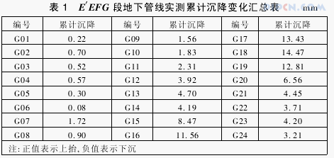 在支护桩和止水桩施工阶段发现南侧及东侧南段(E′EFG段)原设计的支护桩附近的一根重要的地下高压电缆及一根煤气管线无法移除,其中部分管线位置已与支护桩、止水桩位置冲突,故设计院建议将冲突区段钻孔灌注桩(支护桩)变更采用旋挖灌注桩,原双轴深搅桩(止水桩)采用二重管高压旋喷桩施工工艺,以确保支护桩及止水桩施工时不影响管线安全,避免安全事故的发生和造成不必要的经济损失。由于施工工艺改变涉及工程造价增加、工期延长及施工便利性等问题,设计单位建议根据现场实际条件,加强此段的施工监测,通过反馈的施工监测数据,可按原设计方案施工的区段仍按原设计施工,以尽量减少工程造价增加,保证工期。E′EFG段地下管线累计沉降变化汇总见表1(共设置24个观测点,编号为G01~G24)。从表1可以看出,G12~G24(在FG段内)累计沉降变化量较大,但均小于设计累计沉降变形值15mm。通过监测单位认真、仔细的收集此段施工监测数据,及时反馈给设计院进行处理、分析,现场FG段中部支护桩实际采用了10根旋挖灌注桩,EFG段止水桩采用二重管高压旋喷桩施工工艺,其余位置仍按原设计施工。一方面减少了施工对地下管线的影响,确保管线的安全;另一方面也为业主大大减少了工程造价的增加,确保了工期,保证了工程的顺利进行。