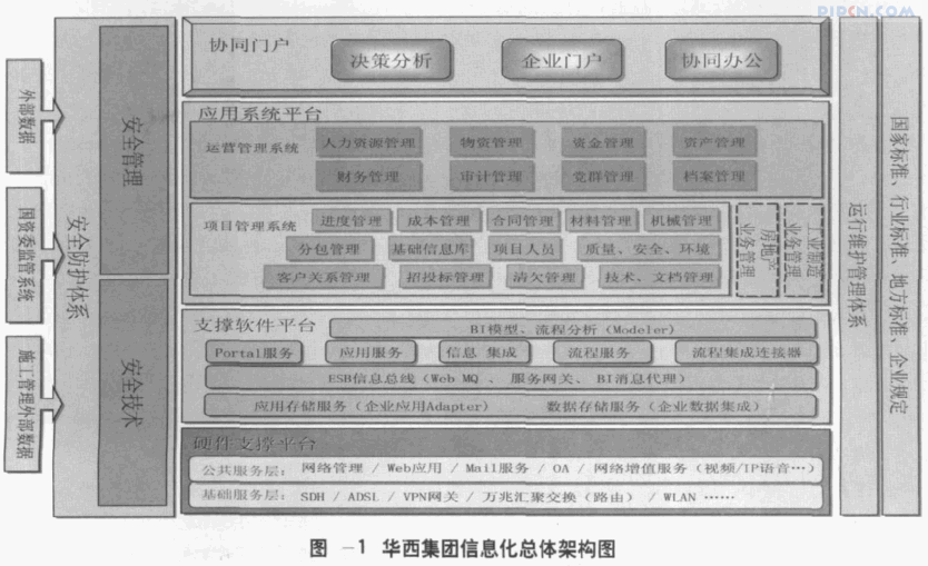 三层平台:在华西集团的管理信息化规划中设计了三层平台支持整个华西集团实现企业管理信息化,三层平台分别是——硬件支撑平台、支撑软件平台、应用系统平台。硬件支撑平台是整个信息化的基础,支撑软件平台是信息系统应用的支撑,应用系统平台是华西集团实现管理信息化的手段。