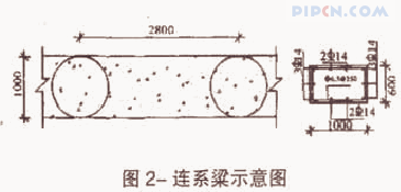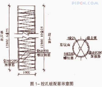 桩与桩之间的基坑壁的处理:土层部分,采用网喷的方法;卵石部分,采用素喷支护。喷射砼中钢筋网片为 6.5@300×300,砼强度为 C20,厚度为 50~80mm,以保证桩间的土层不脱落。挖孔桩及连系梁配筋如图 1、图 2。