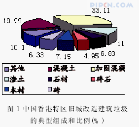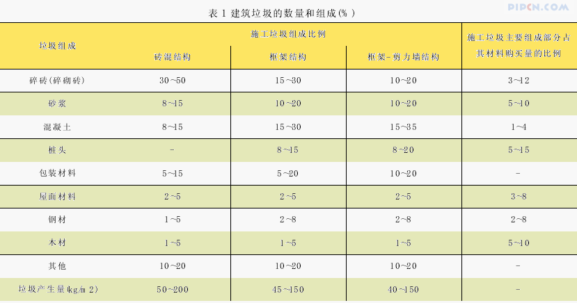 从表 1 可见建筑施工垃圾的成分以及各自所占比例。对不同结构形式的建筑工地, 垃圾组成比例略有不同。而垃圾数量因施工管理情况不同在各工地差异很大。