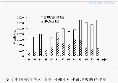 由图 1、图 2 可知, 香港进行旧城改造时产生的建筑垃圾主要是加固混凝土、混凝土、渣土, 其总和达到 65% 。而建筑施工中产生的垃圾主要是渣土、碎石、木材, 其总和达到 55% 。1998 年, 香港特区的建筑垃圾产生量约为 32710t/d。为了处理如此大量的建筑垃圾, 香港采用了如下战略: 将其中的惰性部分( 如沙子、砖头和混凝土) 进行回收利用; 非惰性部分( 如竹子、塑料、木材、纸、蔬菜和其他有机物)作为废物在填埋场填埋。香港特区历年建筑垃圾的产生量统计见图 3, 建筑垃圾中惰性与非惰性部分的比例见图 4。