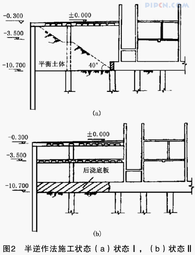 (3)采用半逆作法施工,地面上下同时施工,可缩短施工工期,避免全逆作法施工出土量大的缺点。