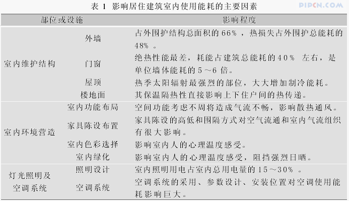 一般来讲,建筑能耗分为建造过程中的能耗和使用过程中的能耗两部分,建造能耗与使用能耗之比大约在1∶9 ̄2∶8,因此,使用能耗的节能措施是节能研究工作中的关键[1]。居住建筑室内使用能耗主要是电力的消耗,而电力消耗最集中的是空调制冷和采暖消耗,其次是家电及照明的消耗,表 1即对影响居住建筑室内使用能耗的主要因素做了简要分析。