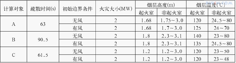 从计算结果来看,对不同的计算对象,当疏散完成时,除起火室外,其他房间的温度和烟气沉降都能较好满足要求。