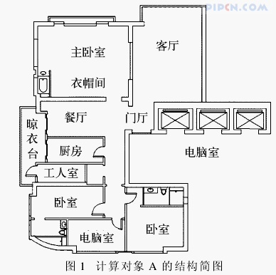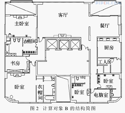 计算对象A面积为236.5m2,净空高度为3m,包括客厅、门厅、卧室、卫生间、餐厅、厨房、晒衣台、工人房、电脑室等,如图1所示。
