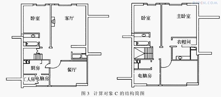 计算对象B面积为473.05m2,净空高度为3.1m,包括客厅、门厅、主卧室、卫生间(主卧和公用)、书房、三个卧室及其卫生间、餐厅、厨房、晒衣台、工人房、电脑室及阳台等,如图2所示。计算对象C为复式户型,面积为279.18m2,上、下层的净空高度为3m,包括复式下层卧室及卫生间、复式下层客厅、复式下层公用卫生间、复式下层厨房、复式下层餐厅、复式下层晒衣台、复式下层工人房、复式上层三个卧室及其卫生间、复式上层电脑室等,如图3所示。