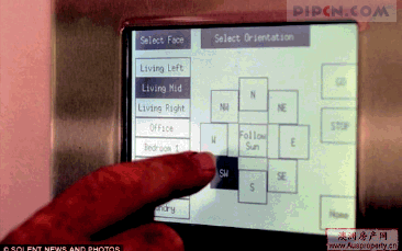 与建造一般房屋相比,建造随着太阳旋转的房屋需解决两个难题。第一个难题是动力问题,房子整体重量为30t左右,根据房子的总体重量设计出相应的动力传输和运行机制。动力装置安装在房子中间,每个房间都和这个转动动力装置相连。整个动力装置由两个小型电机驱动,电机的功率、大小和洗衣机电机差不多。在卧室和客厅的墙上都装有一块液晶触摸屏,只需点击便可以控制房屋转动的方向和角度。