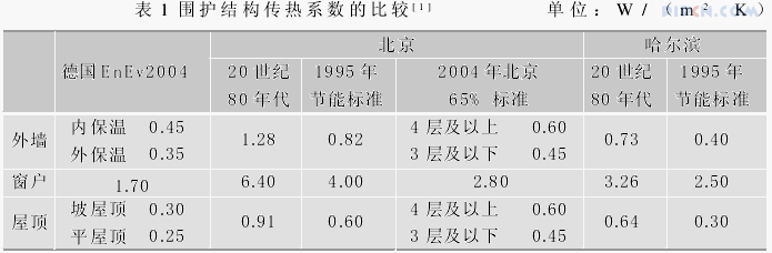 我国城市既有住宅量大、面广,因绝大多数都没有采取节能措施,能耗高、性能差,浪费严重。表 1 所示为我国北京与哈尔滨两城市住宅围护结构传热系数与德国 EnEv2004 标准的比较。可以看出,20 世纪80 年代我国北方采暖地区住宅围护结构的传热系数是德国的3~4 倍,意味着以北京80 年代保温水平计算,在同样室温条件下,北京住宅建筑的采暖负荷大致是德国的3~4 倍。在1995 年《民用建筑节能设计标准(采暖居住建筑部分)》出台以后,各项指标有所改善,但是在窗户的节能效果上差距依然较为明显。(参考《建筑中文网》)