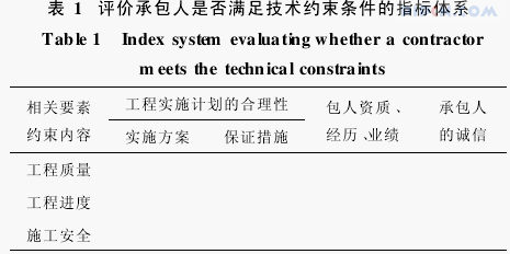 (2)评价承包人是否满足约束条件的指标体系。根据约束条件内容和相关因素,可建立如表1所示评价承包人是否满足约束条件的指标体系。