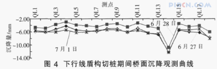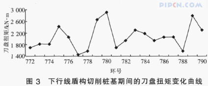 下行线盾构切削桩基施工从2009年6月22日开始,至29日结束, 盾构掘进从772环到790环。