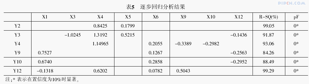 其中,cij 为 Xj 的系数。回归结果见表 5。表 5 最后两列分别表示拟合优度系数及模型整体显著性 F 检验伴随概率,由逐步回归结果分析可知: