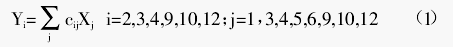 其数学原理为:设两个随机变量向量为 X=(x1,x2,…,x)p′和 Y=(y1,y2,…,y)q′。为研究 X 与 Y 之间的线性关系,需要找到一组系数 Ak′=(ak1,ak2,…,ak)p,Bk′=(bk1,bk2,…,bk)q,通过线性组合得到的一组新随机变量 u=(u1,u2,…,u)k和v=(v1,v2,…,vk),有 uk=ak1x1+ak2x2+…+akpxp=Ak′X,vk=bk1y1+bk2y2+…+bkqyq=Bk′Y,使得 uk 与 vk 之间的相关系数 ρk 最大,即{Ak′,Bk′|ρk=max(cor(uk,vk)),k=1,2,…,k},且{co(rui,u)j=0,cor(vi,v)j=0;i,j=1,2,…,K,i≠j},其中 k=min(p,q)。此时,称 U 与 V 为典型变量,ρk 为典型相关系数。
