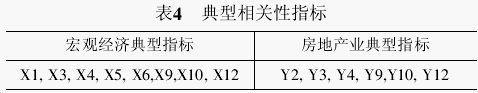 (2)分析典型相关指标的权重可见,宏观经济典型变量中 X5(货币供应量 M0)的权重最高,说明货币供应对于我国房地产业的发展起着关键作用;而房地产业典型因子中,Y2(房地产开发投资完成额)权重优势明显,可见房地产业开发投资额受宏观经济形势的影响最大。根据典型相关分析结果,可以对宏观经济指标和房地产发展指标进行筛选,得到二者间具有显著典型相关性的指标,见表 4。