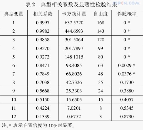对宏观经济指标与房地产业发展指标进行典型分析,得到典型相关系数值、显著性检验统计量及概率值(见表2)。