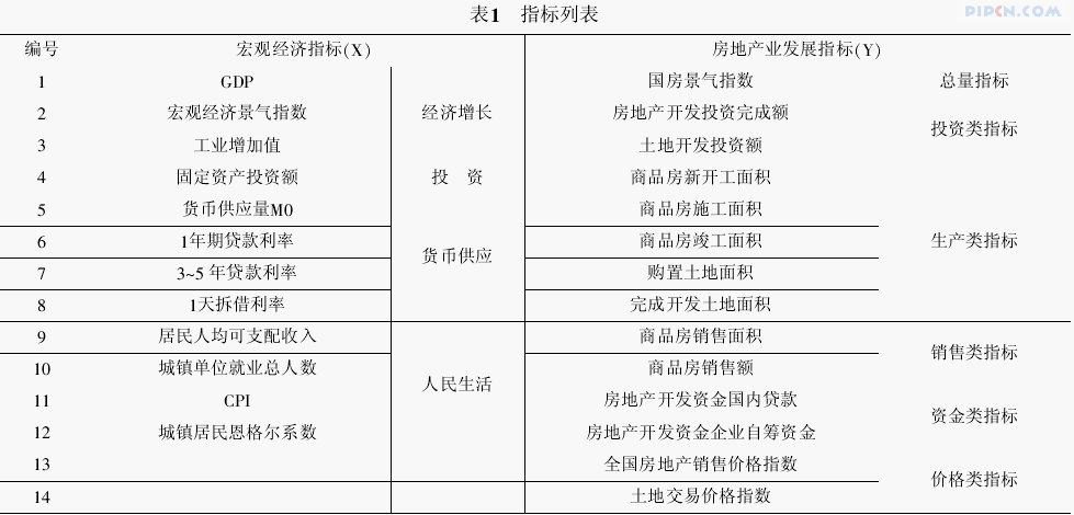 衡量宏观经济及房地产业发展状况的指标很多,本文从经济增长、社会投资、货币供应及人民生活状况等四个方面选择宏观经济指标;从总量指标、投资类指标、生产类指标、交易类指标、资金类指标及价格类指标六个层面选择房地产业发展指标。